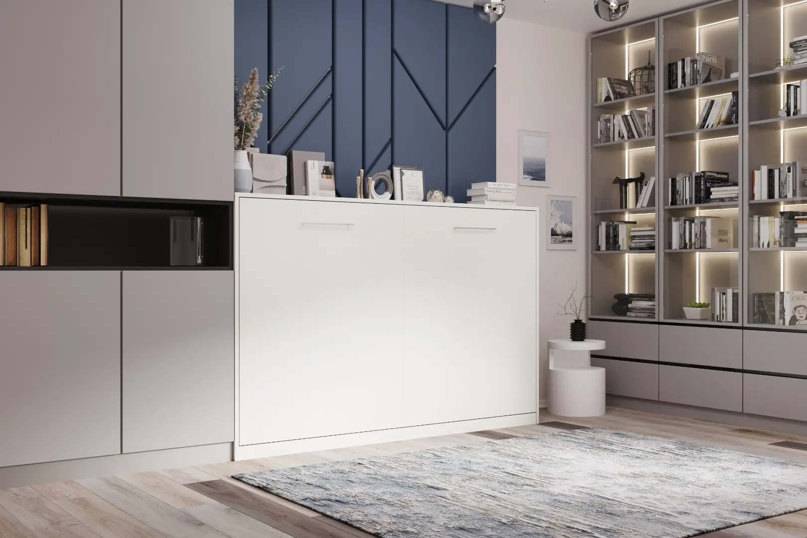 Горизонтальная шкаф-кровать "Solo Start".  Работает на механизме раскладывания собственной разработки "Start". Кровать раскладывается легким движением руки, превращаясь в полноценное спальное место. Просто потяните ее за ручки, расположенные на фасаде и выставите ножки-опоры.
